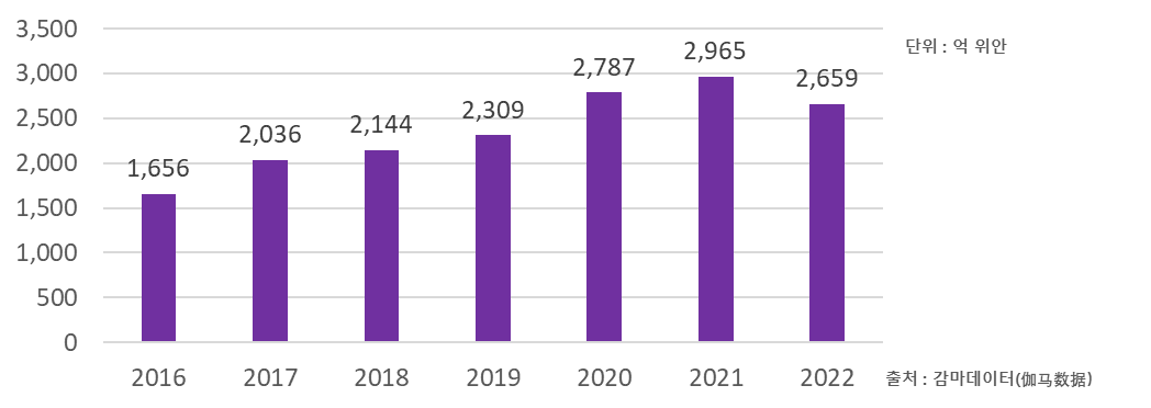 •2023년 2월 14일 광저우에서 열린 중국게임산업 연차총회에서 중국영상디지털출판협회 게임위원회(中国音数协游戏工委)와 중국게임산업연구원(中国游戏产业研究院)이 공동으로 발표한 2022년 중국게임산업보고서에 의하면, 2022년 중국 게임시장 매출 규모는 전년 대비 약 10% 감소하여 약 2,659억 위안(한화 약 48조 원)으로 나타남