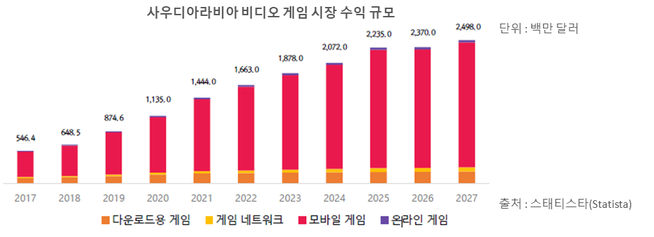 - 사우디아라비아 게임 시장은 다운로드용 게임, 게임 네트워크, 모바일 게임, 온라인 게임으로 구분되며, 가장 규모가 큰 항목은 모바일 게임임