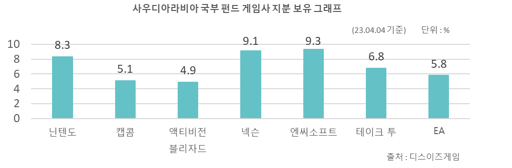 - 23년 4월 4일 기준 사우디아라비아 국부 펀드는 주요 게임사의 지분 보유를 5~9% 확보한 상황임