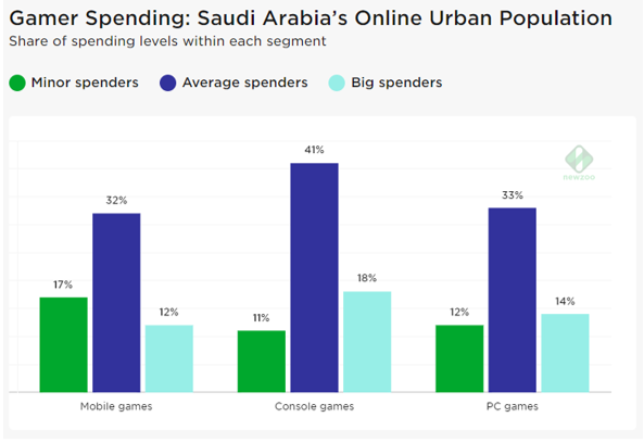 ・In Saudi Arabia’s gaming population, 32% are “average spenders” while Western Europe’s share is just 18%.
